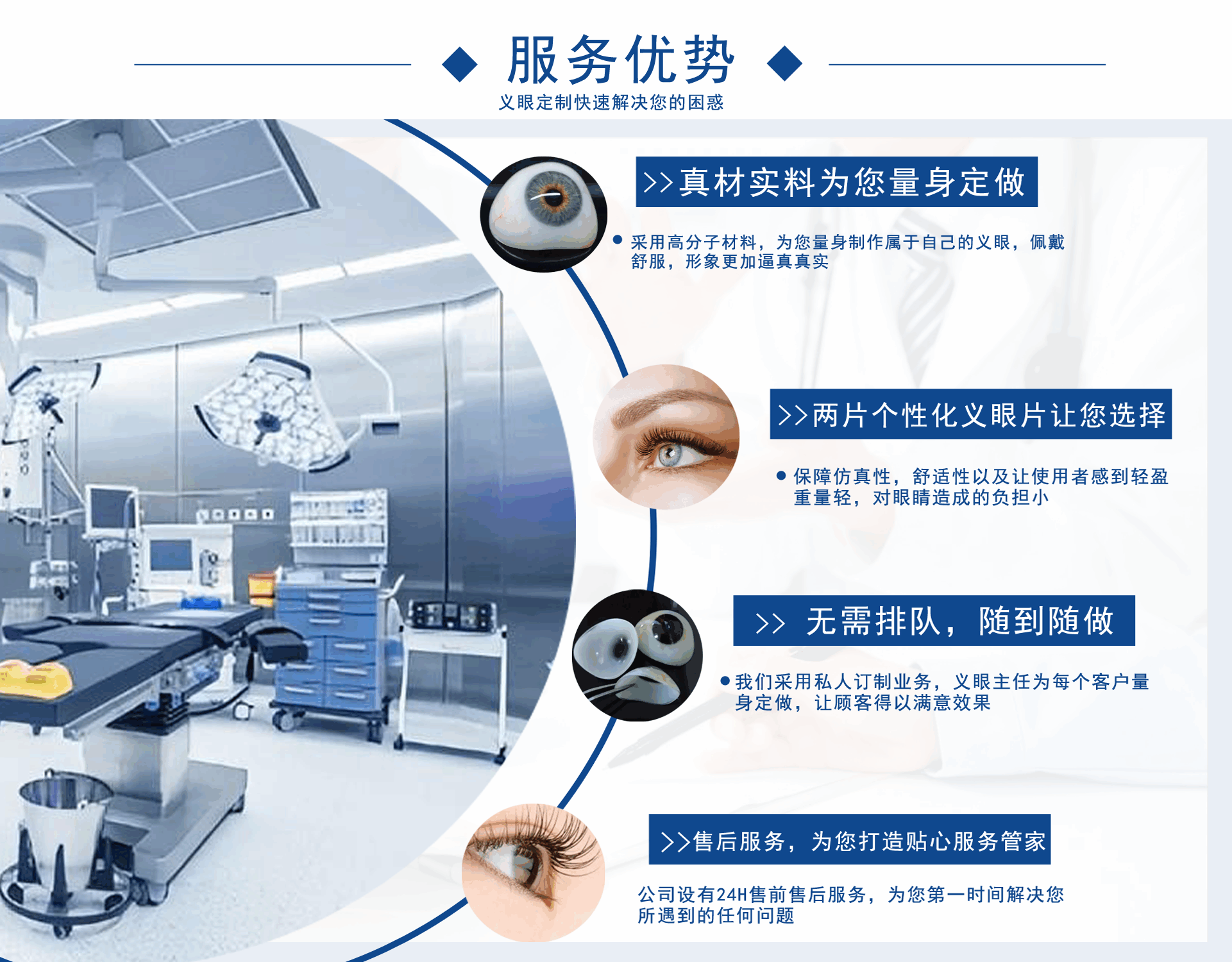 正目醫療科技有限公司致力于為用戶提供假眼,在哪里可以定制義眼,義眼哪家好,假眼價格,義眼價格,義眼費用,義眼公司,是集義眼定制、保養、咨詢為一體的綜合性義眼定制企業。  獨創的義眼工藝結構,根據仿生物學原理,采用進口醫用植入材料:高分子材料、無毒素、性能穩定、堅固耐用)、聚甲基丙乙烯阝-羥乙酯HEMA材料(軟性親水性材料),結合獨特的義眼個性化佩戴技術,按佩戴者健眼的形態、角膜、虹膜、及瞳孔的大小、色澤、血管紋理和脂肪分布,設計制作。擁有超薄、質輕、光滑、親水透氧、佩戴舒適和高逼真的特點。為保證佩戴效...